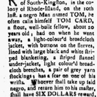 Ran-away from the subscriber, of South Kingston, in the colony of Rhode Island, on the 10th inst. A negro man named Tom, he often calls himself Tom Card, a stout, well-built fellow, about 20 years old, had on when he went away, a light colored…