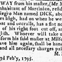 RUNAWAY from his master, (Mr. M. I' Comte, an inhabitant of Martinico, resident in Milford.) a Negro Man named DICK, about 5 feet 4 or 5 inches high, had on when he went away, a woolen coat and overalls, has a flat nose, and the great toe of his…