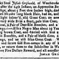 RUN-away from Josiah Griswold, of Weathersfield, the Night after the 24th Instant, an Apprentice Boy about 17 Years of Age, about 5 Feet thre Inches high, dark Complexion, wears his own long black Hair, had on, and carried with him, a light colour'd…