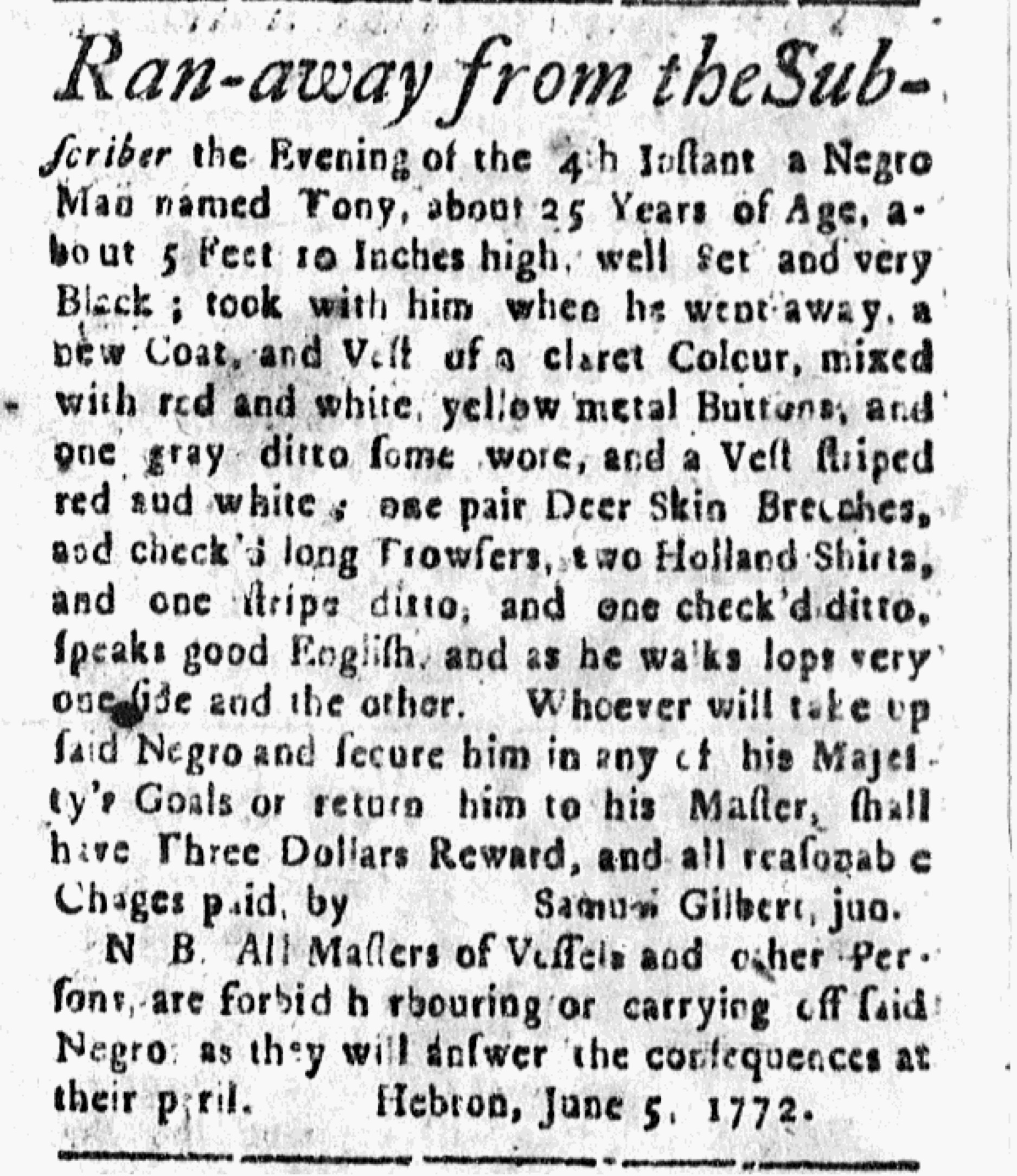 Ran-away from the Subscriber the Evening of the 4th Instant a Negro Man named Tony, about 25 Years of Age, about 5 Feet 10 Inches high, well set and very Black; took with him when we went away a new Coat and Vest of a claret Colour, mixed with red and white, yellow metal Buttons, and one gray ditto some wore, and a Vest striped red and white; one pair Deer Skin Breeches, and check'd long Trowsers, two Holland Shirts, and one stripe ditto, and one check'd ditto, speaks good English and as he walks lops very one side and the other. Whoever will take up said Negro and secure him in any of his Majesty's Goals or return him to his Master, shall have Three Dollars Reward, and all reasonable Charges paid, by Samuel Gilbert, jun. N. B. All Masters of Vessels and other Persons are forbid harbouring or carrying off said Negro, as they will answer the consequences at their peril. Hebron, June 5, 1772.
