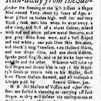 Samuel Gilbert, advertisement for Tony, Connecticut Courant, June 9, 1772, accessed December 14, 2025, https://runaway.fairuse.org/runawayct/items/show/4488.