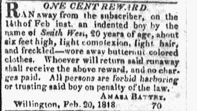 Amasa Battey, advertisement for Smith West, Connecticut Courant, February 24, 1818, accessed December 13, 2025, https://runaway.fairuse.org/runawayct/items/show/4991.
