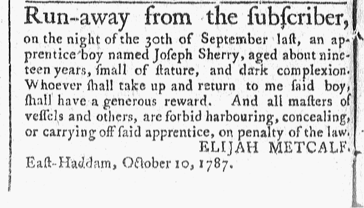 Elijah Metcalf, advertisement for Joseph Sherry , Connecticut Journal , October 24, 1787, accessed December 14, 2025, https://runaway.fairuse.org/runawayct/items/show/5535.