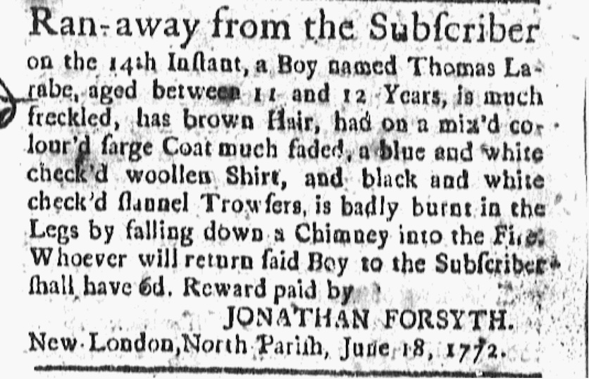 Ran-away from the Subscriber on the 14th Instant, a Boy named Thomas Larabe, aged between 11 and 12 Years, is much freckled, has brown Hair, had on a mix'd colour'd sarge Coat much faded, a blue and white check'd woollen Shirt, and black and white check'd flannel Trowsers, is badly burnt in the Legs by falling down a Chimney into the Fire. Whoever will return said Boy to the Subscriber shall have 6d. Reward paid by JONATHAN FORSYTH. New London, North Parish, June 18, 1772.