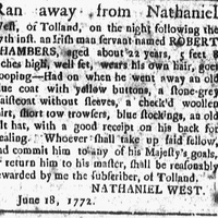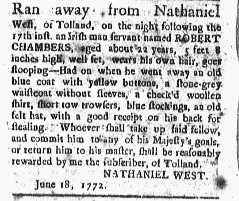Ran away from Nathaniel West, of Tolland, on the night following the 17th inst. an Irish man servant named ROBERT CHAMBERS, aged about 22 years, 5 feet 8 inches high, well set, wears his own hair, goes stooping–Had on when he went away an old blue coat with yellow buttons, a stone-grey waistcoat without sleeves, a check'd woollen shirt, short tow trowsers, blue stockings, an old felt hat, with a good receipt on his back for stealing. Whoever shall take up said fellow, and commit him to any of his Majesty's goals or return him to his master, shall be reasonably rewarded be me the subscriber, of Tolland, NATHANIEL WEST.